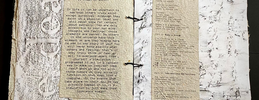 < I tried out putting my homemade paper through the printer. I didn't know if would work or if it would break my printer but surprisingly I was able to print onto most of the sheets. I think I made the paper thickness just right for the printer, only 1 sheet jammed because it was too thin, and one sheet wouldn't go through as it was too thick. I printed most of the text and images onto the homemade paper, some images I had to print out on regular paper due to some images appearing too washed out on the homemade paper. I also printed things like long poems onto regular paper as due to the font sizes on those poems, the texture on the home made paper made the writing hard to read.