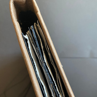 I then decorated the front cover with a spare sheet of home made paper, sticks I picked up from the Howff, a natural print of a fresh leaf I made on fabric, as well as some scraps from my graphite rubbings.